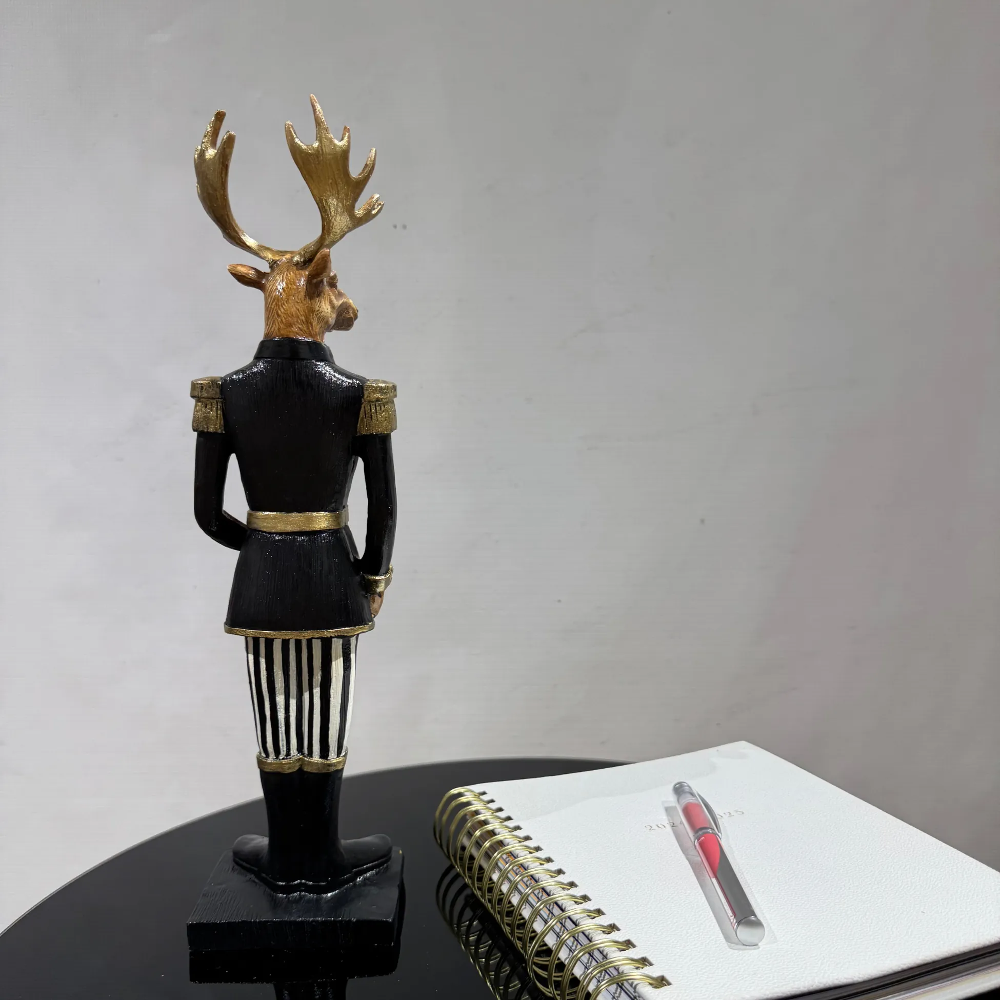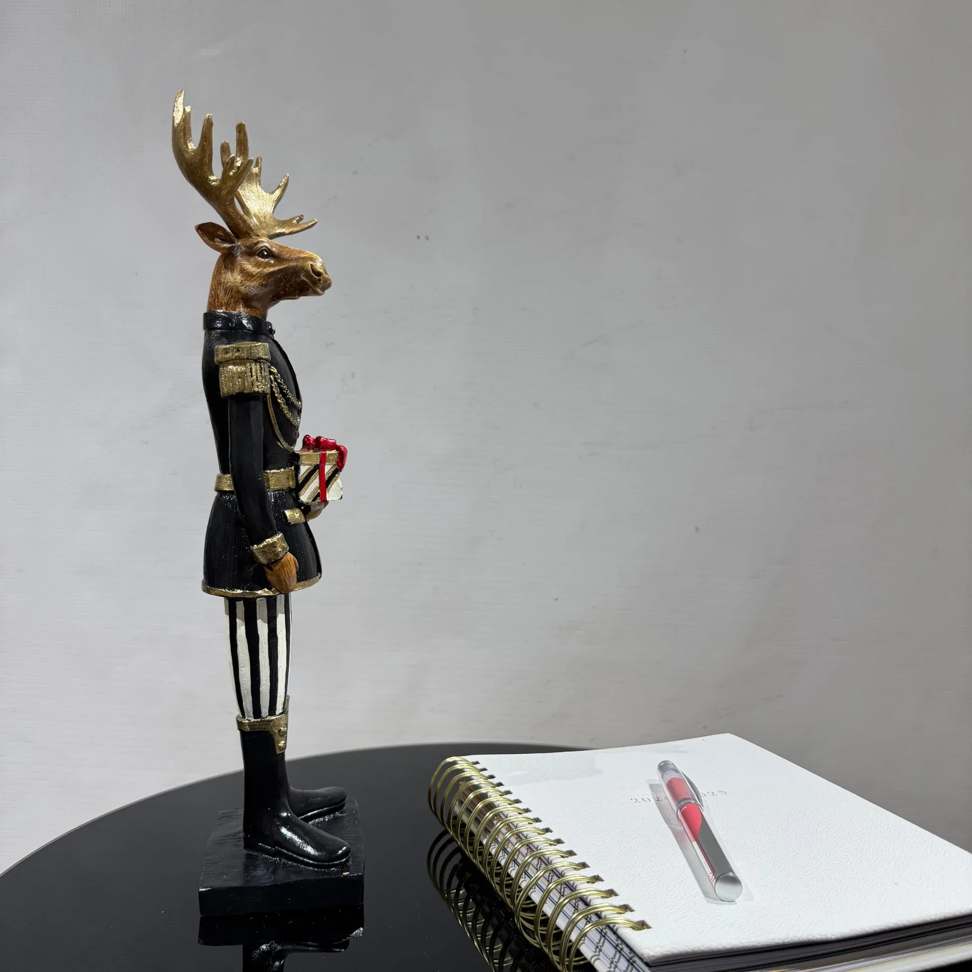 Our product photos are exclusive to Ferozzi. Unauthorized use of these images is strictly prohibited. The sale includes only the black jacket deer figurine holding a gift box as shown in the photos; other decorative items are not included.