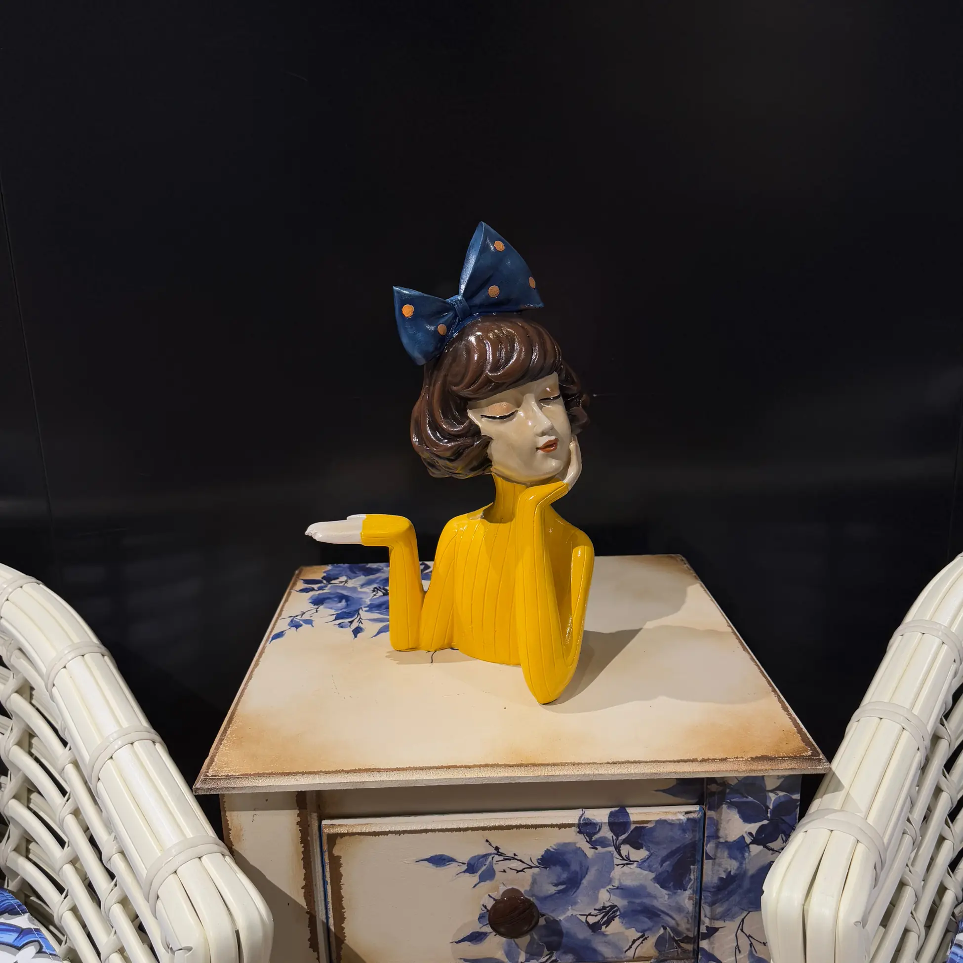 Add a touch of charm and sophistication to your home with the Ferozzi Charming Yellow Decorative Bust Handmade. This unique artisan-crafted piece showcases a vibrant yellow outfit, intricate facial features, and a stylish blue bow with gold accents, making it a standout addition to any space.