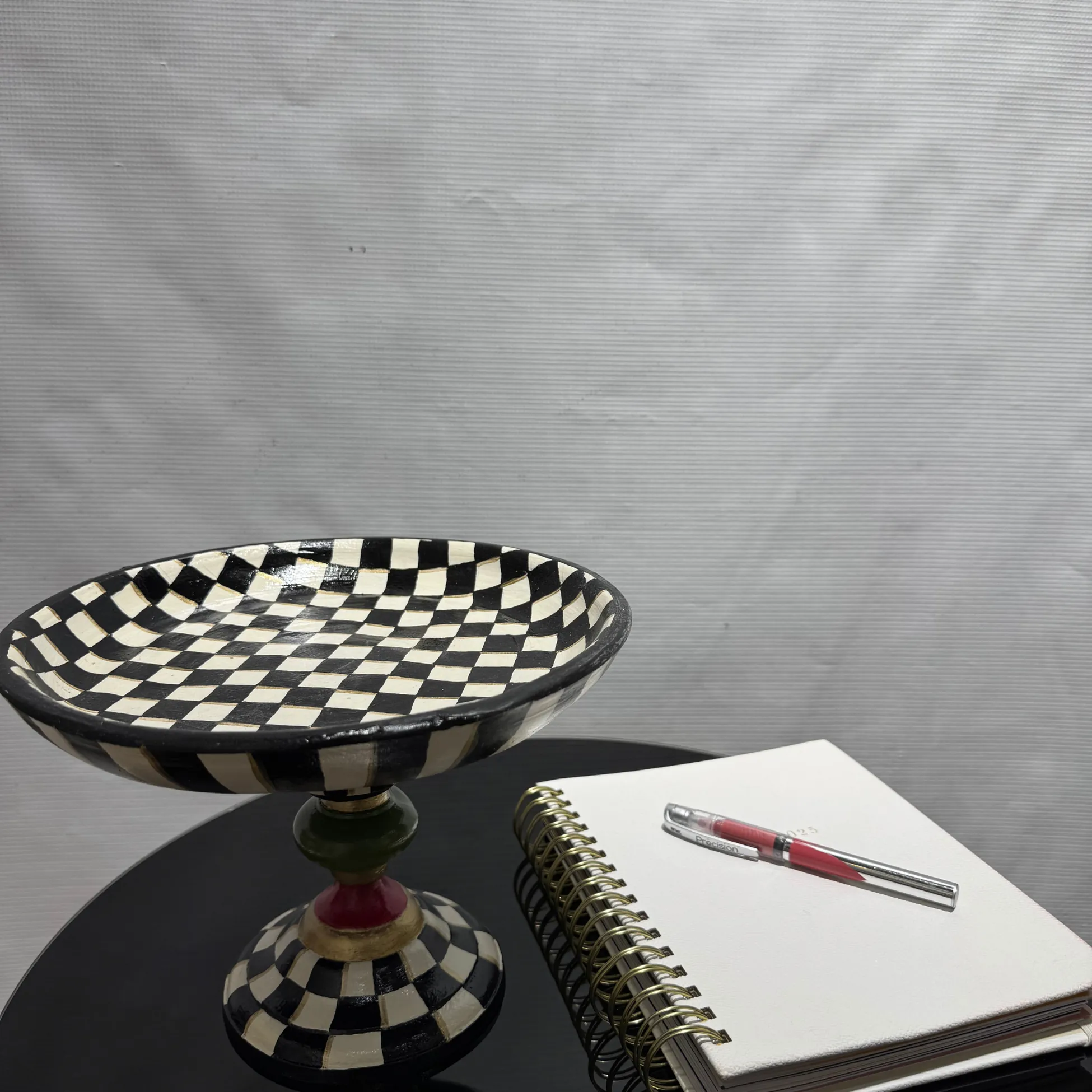 Designed for home decor enthusiasts, art collectors, and lovers of bold patterns, this handcrafted pedestal bowl elevates any space with its luxurious yet playful appeal. The contrasting black-and-white checkered pattern, hand-painted golden details, and vibrant pedestal accents make it a standout statement piece.