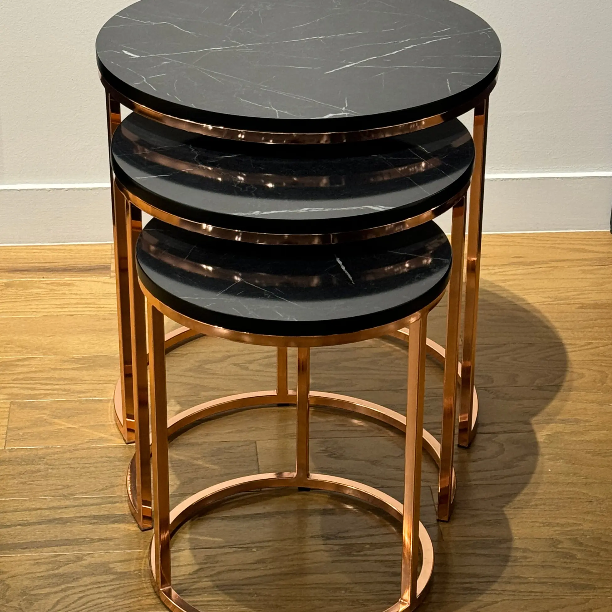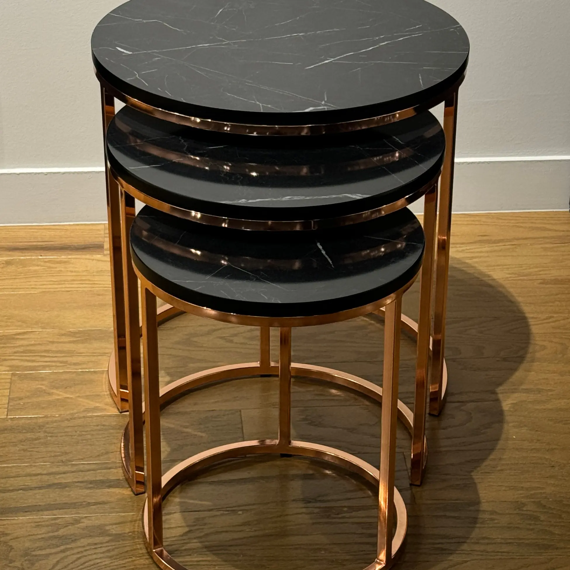 The tables are crafted with durable MDF tops, finished in a realistic black marble effect, offering a sleek and timeless look. The rose gold metal frames provide a modern touch while ensuring durability and stability, making these tables both stylish and functional.