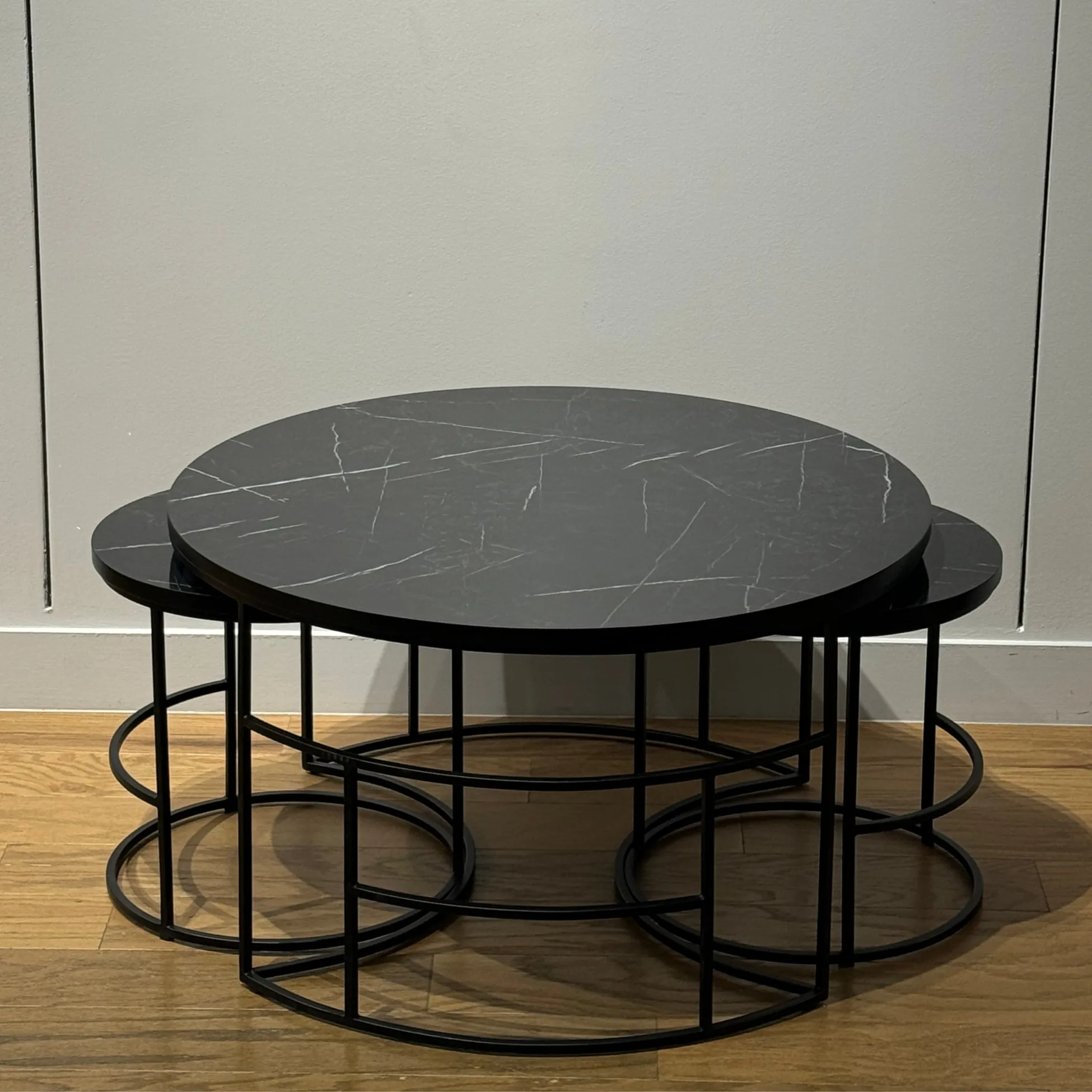 The tabletops are crafted with high-quality MDF surfaces, finished with a realistic black marble veneer that exudes elegance. The sturdy metal frames provide exceptional stability and a sleek, modern look, ensuring the tables are both durable and stylish for everyday use.