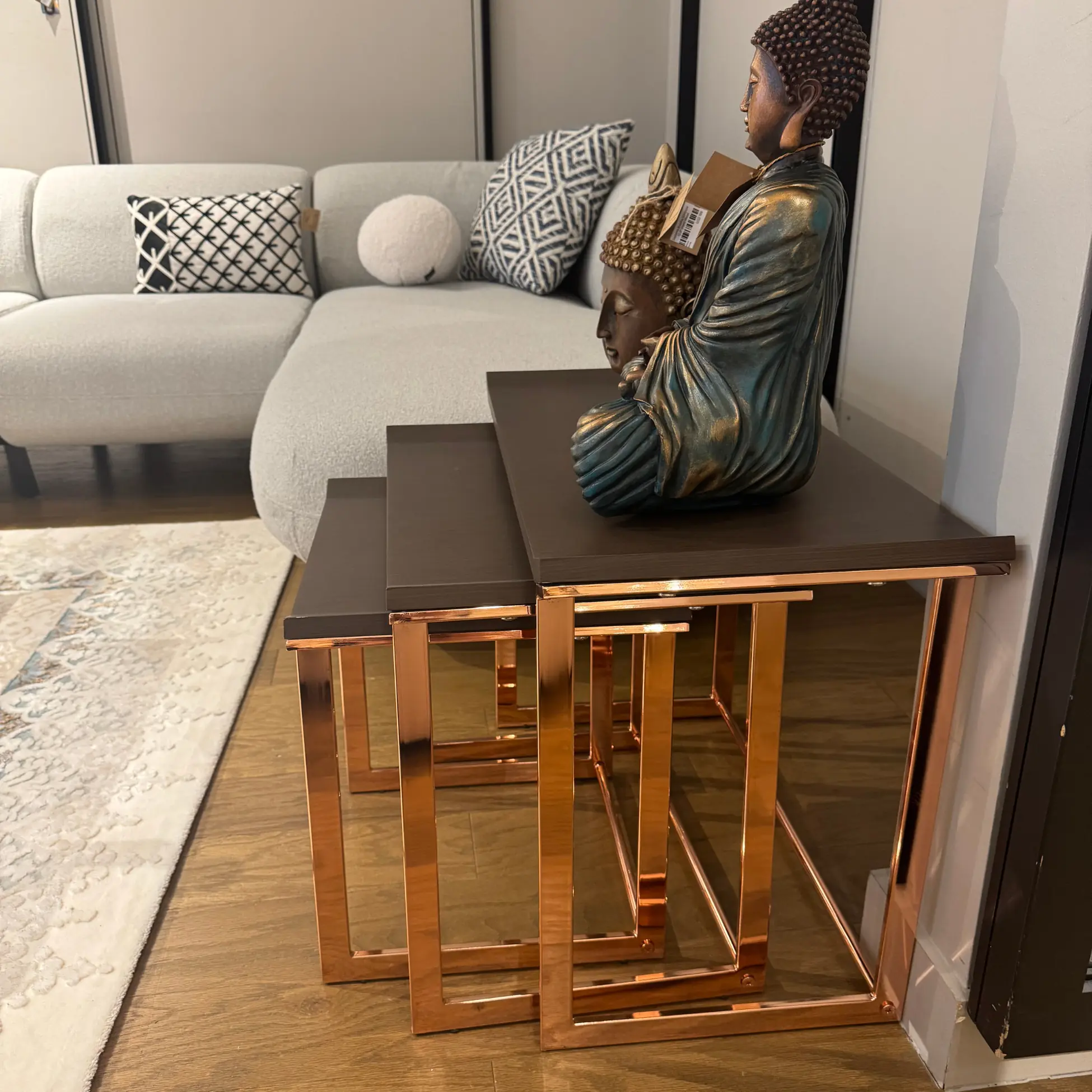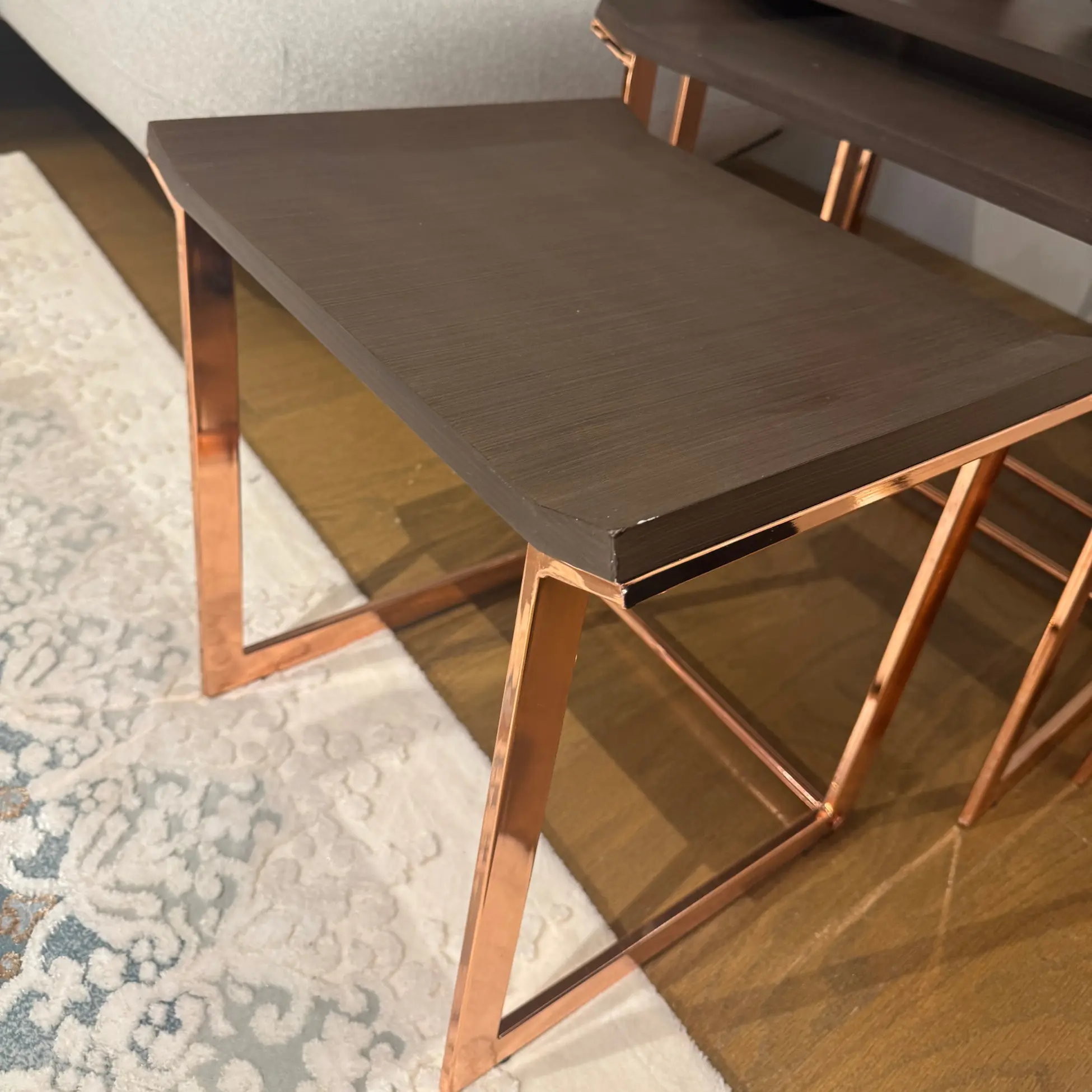 Redefine elegance and functionality with the Ferozzi OEL-14 Modern Nesting Table Set, a stunning addition to any contemporary living space. Designed with a sleek copper frame and a luxurious dark wood finish, this table set blends modern aesthetics with practical use.