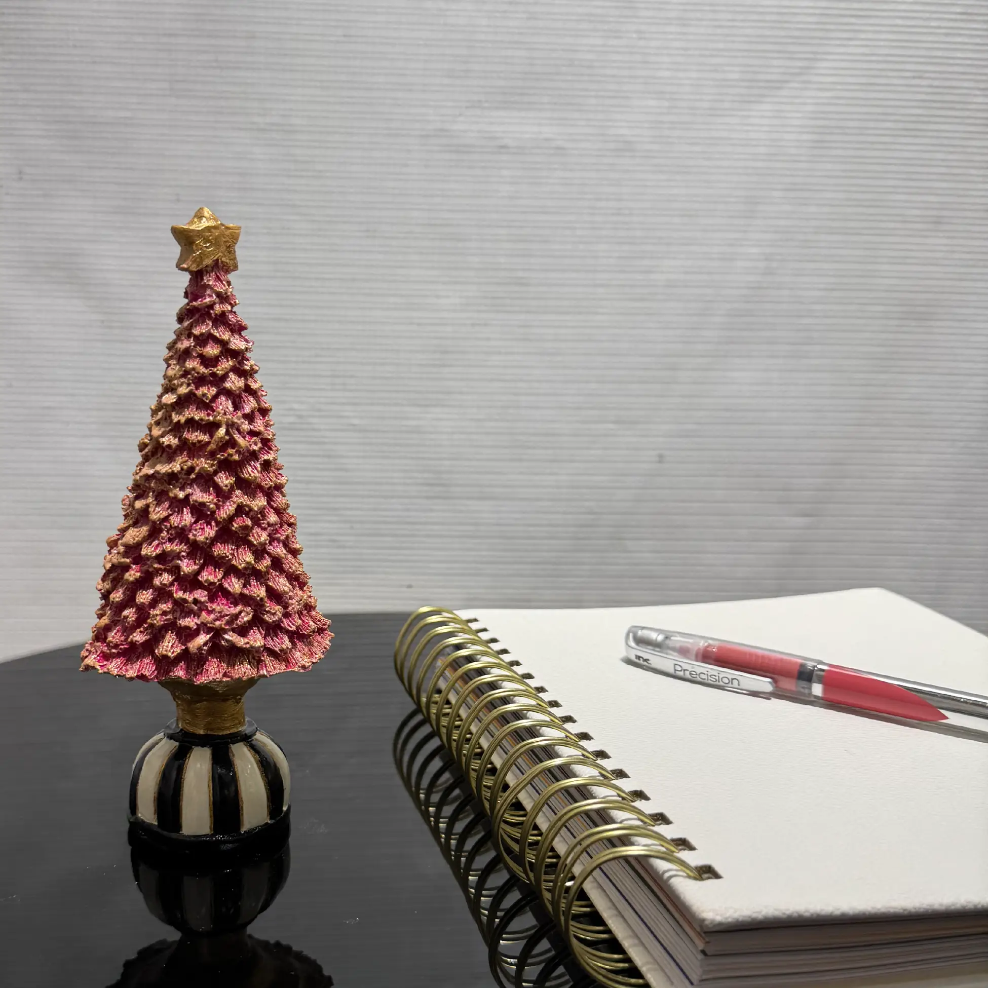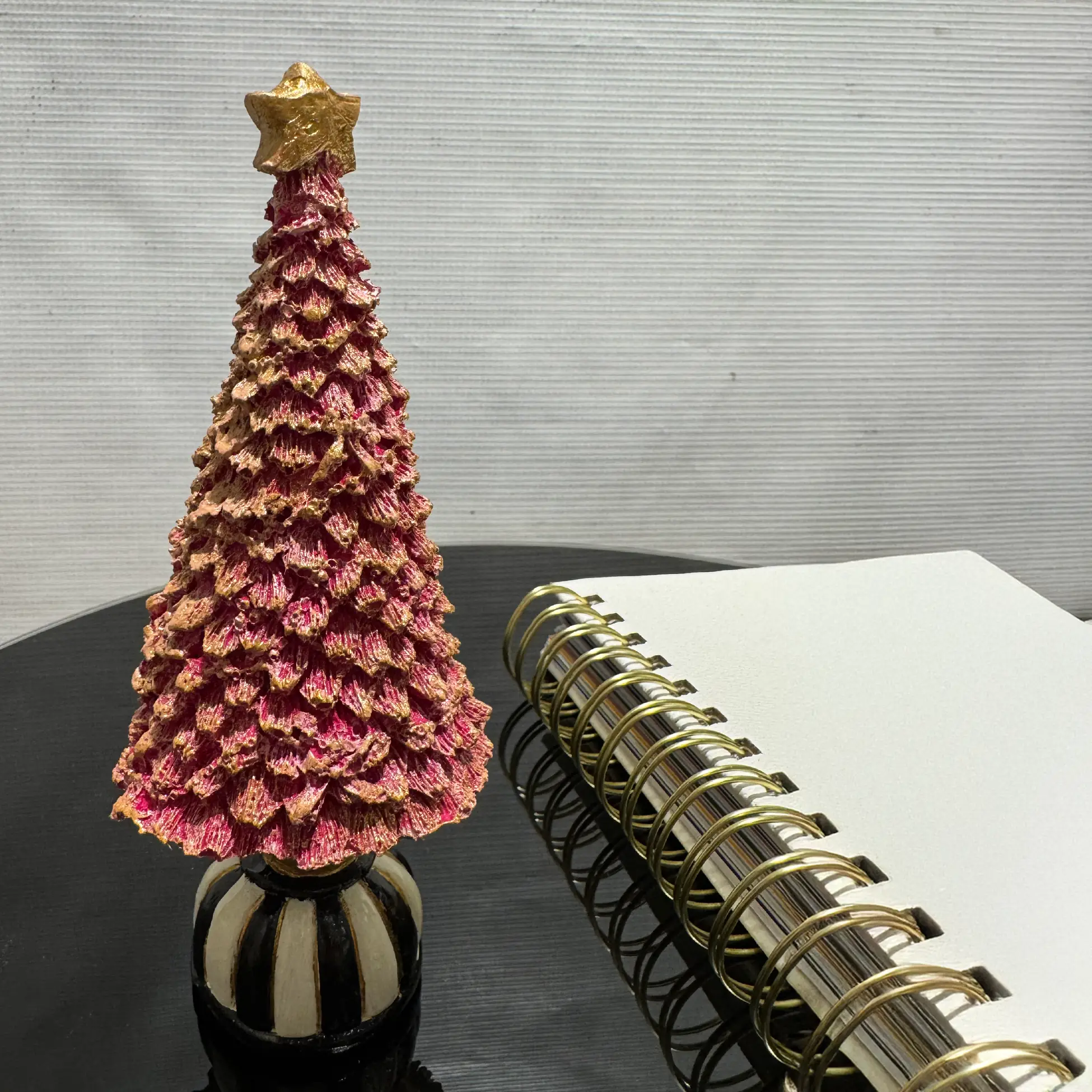 Add festive charm to your home with this Handmade Pink Christmas Tree Figurine. Featuring a golden star topper and a black-and-white striped base, this unique ornament is perfect for holiday décor. Crafted with precision, it’s a standout piece for any modern or traditional Christmas setting.