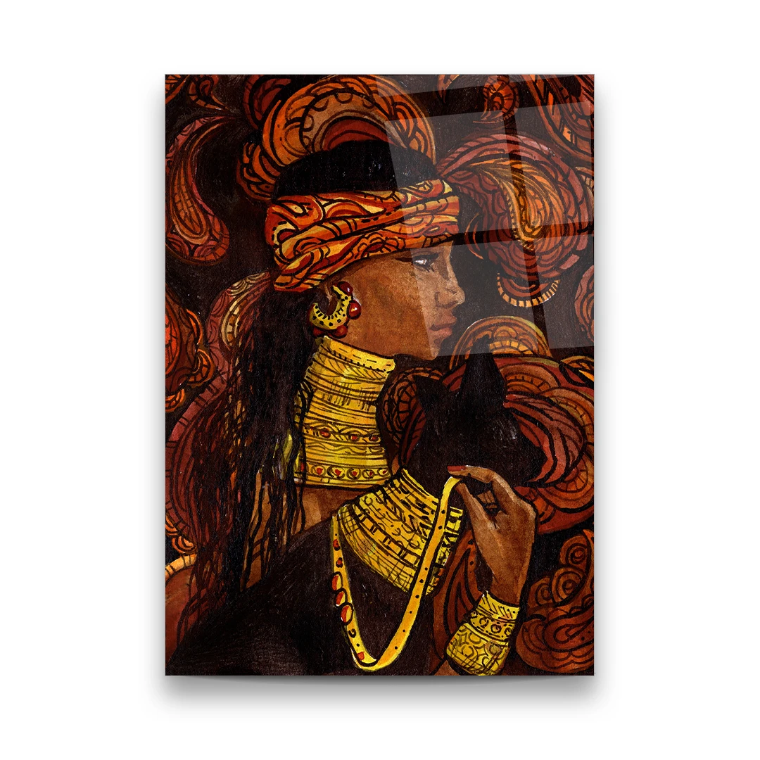 Portrait of Woman and Cat with Ethnic Floral Ornament - Rectangle Wall Glass Art