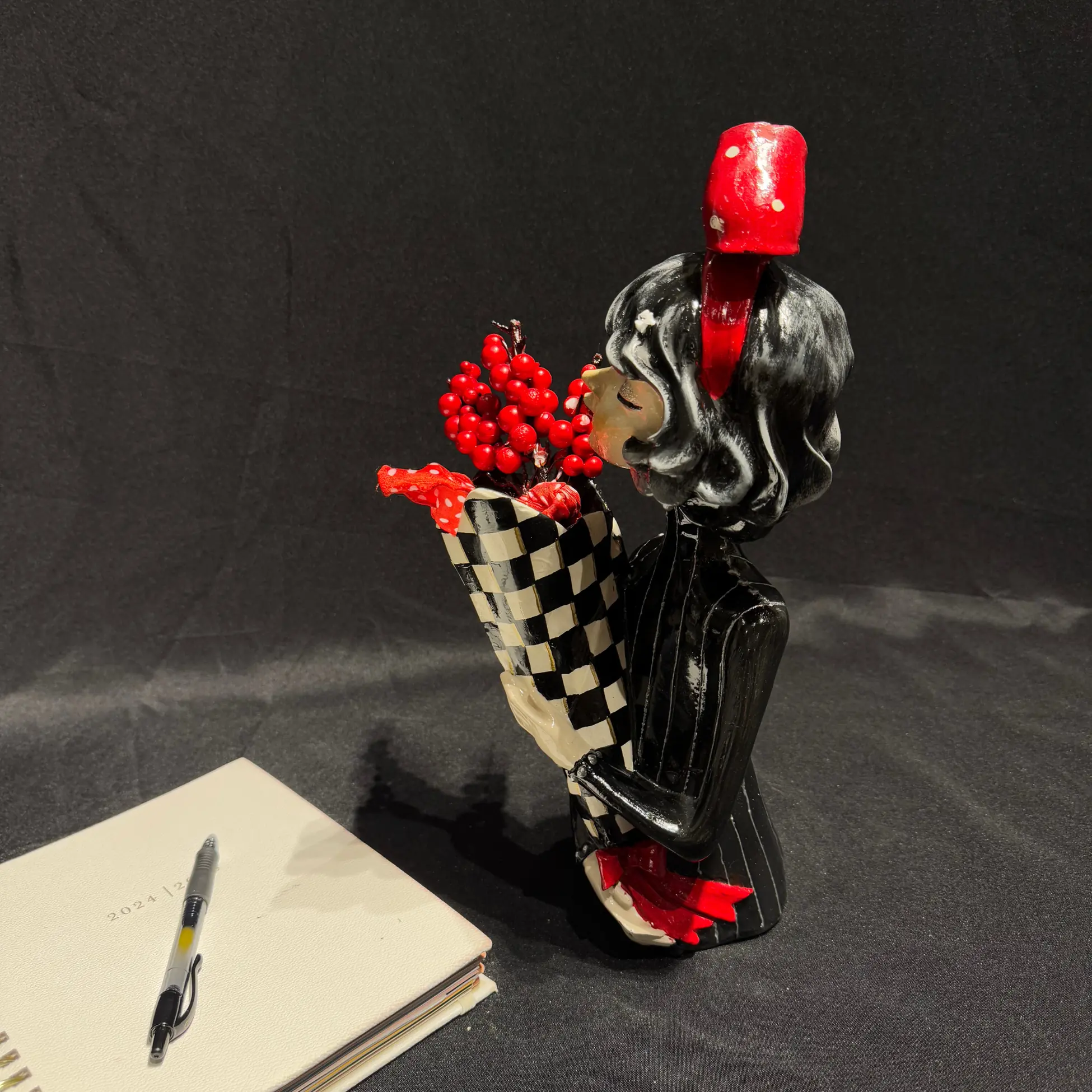 Bring charm and style to your living space with the Red Elegance Lady Statue Handmade. This meticulously handcrafted piece showcases a sophisticated female figure holding a checkered bouquet, adorned with vibrant red accents, including a striking red bow.