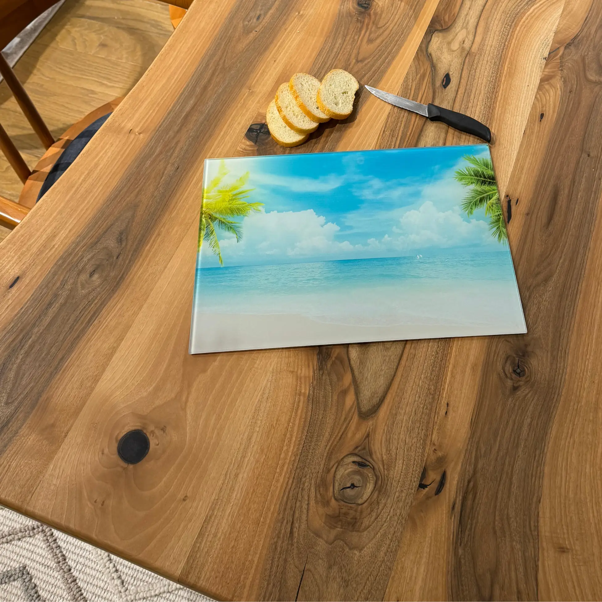 Bring a tropical vibe to your kitchen with the Ferozzi Tempered Glass Cutting Board, featuring a serene beach and palm tree design. This shatterproof, heat-resistant cutting board offers a hygienic, scratch-resistant surface, perfect for food preparation while adding a touch of coastal elegance